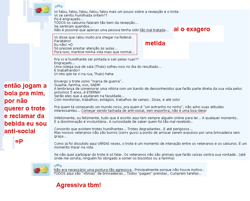 Então eu la olhando pra trás (do outro lado da rua estavam meu pai e meu namorado e eu queria que eles me tirassem dali, afinal queria ir embora) viro pra frente a menina enfia um biscoito num copo com algo não identificado e enfia na minha boca, era algo com alcool só não sabia o que era (eu não bebo e detesto álcool mas engoli aquilo). Nesse momento meu desespero em sair dali aumentou, eles ainda queriam que eu esperasse o proximo calouro segurando a faixa e o sacão de polvilho mas acho que eu tava muito feliz na hora pra xingar todo mundo. (lol)