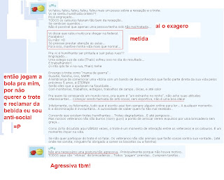 Sobre os trotes descubro que quase tudo sobre ele, inclusive o dia estava sendo mantido em segredo, poucas coisas como uma creme nojento para comer, sobre cortar as pontas dos cabelos, sobre uma tinta que volta no terceiro dia (depois que você acha que ela já saiu) foram o que achei de informação, ansiedade e medo foram se formando dentro da minha barriguinha.